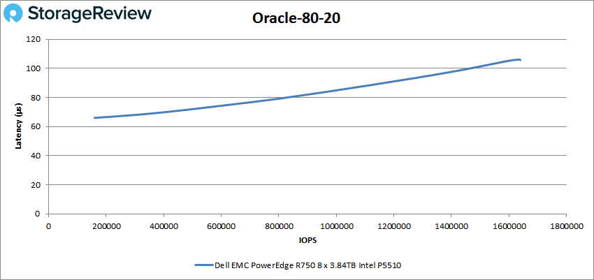 其次是Oracle 80-20,我们看到R750再次以低于100µs的延迟运行了大多数时间。峰值IOPS为164.0万,延迟仅为106µs。