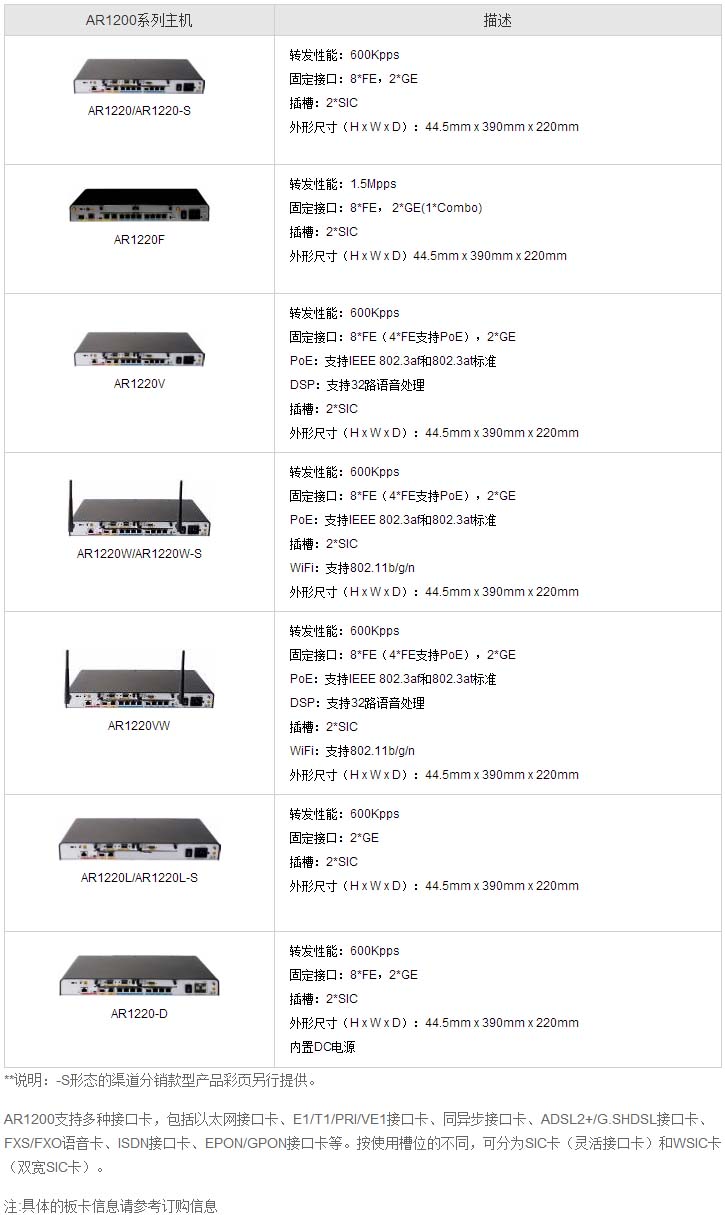 AR1200系列包含以下几款设备:AR1220/AR1220-S、AR1220V、AR1220W/AR1220W-S、AR1220VW、AR1220L/AR1220L-S、AR1220-D,AR1220F,其外观如下: